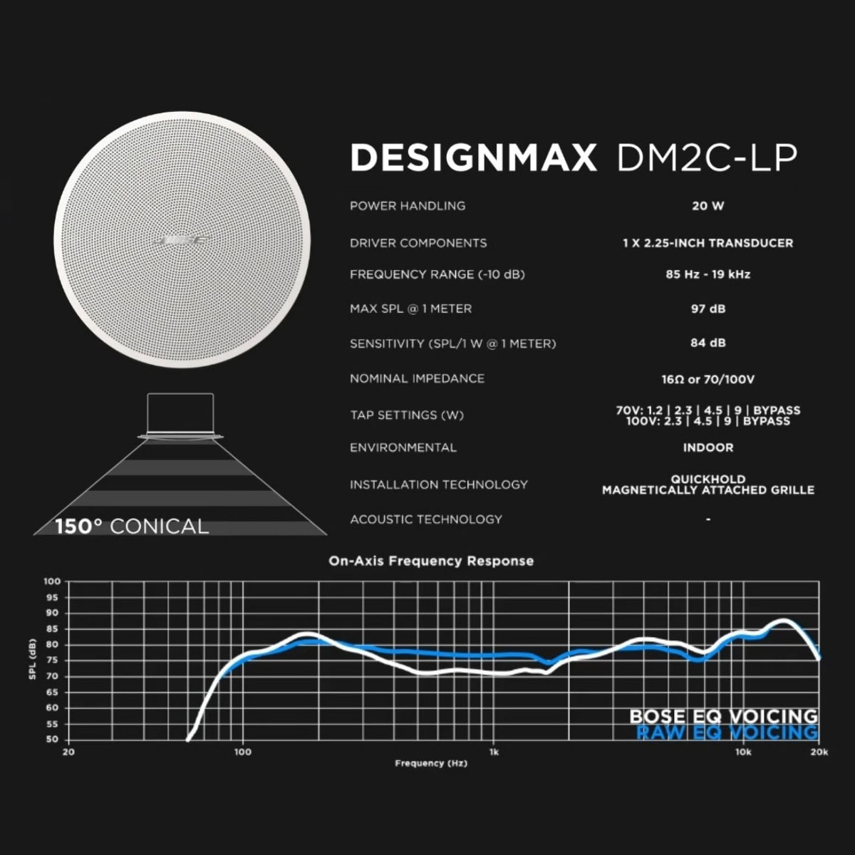 • BOSE DesignMax DM2C-LPは、BGM、映画、業務用オーディオ用途に適した優れた周波数レンジとパワーハンドリングを持ち、システム設計と設置の柔軟性を提供する、多用途で設置が簡単な天井埋め込み型スピーカーです。